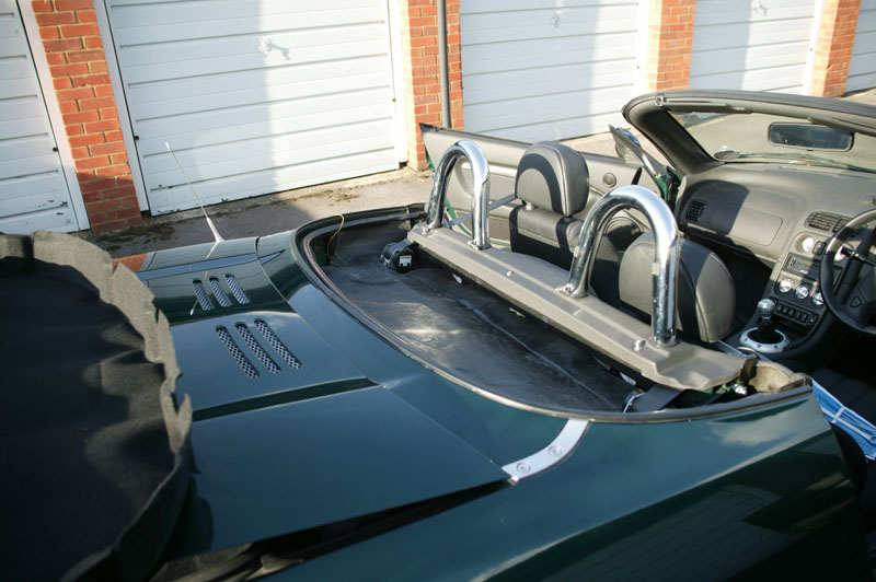 Here you can see the hard top clips bolted in place. I can now put the hard top on with no frame underneath, and actually use my parcel shelf! Incidentally if anyone is wondering, I hung the BAS hood where the hard top was.